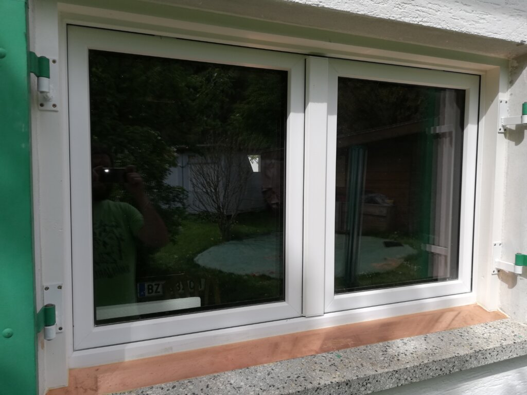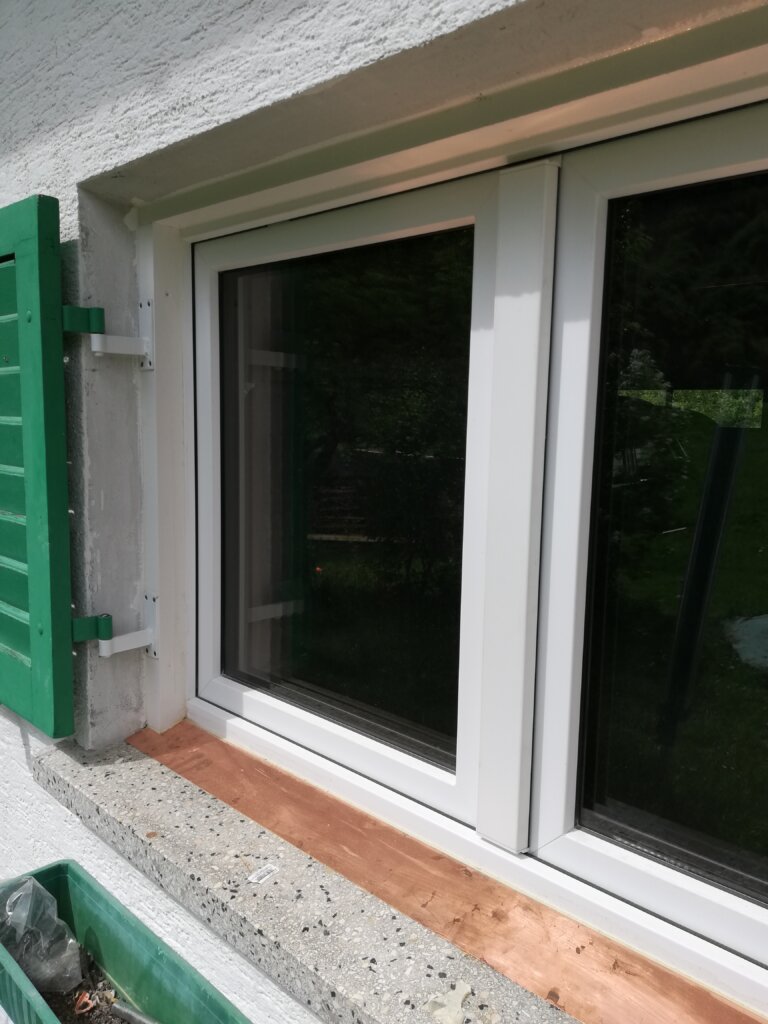 Außen auf den Kunststofffenstern wurden zuerst Kupferbleche für den Abschluss an der Fensterbank, danach hölzerne Ladenleisten angebracht. Diese wurden weiß lackiert.