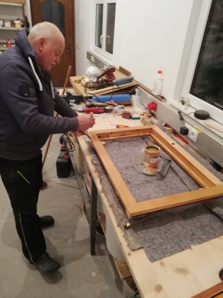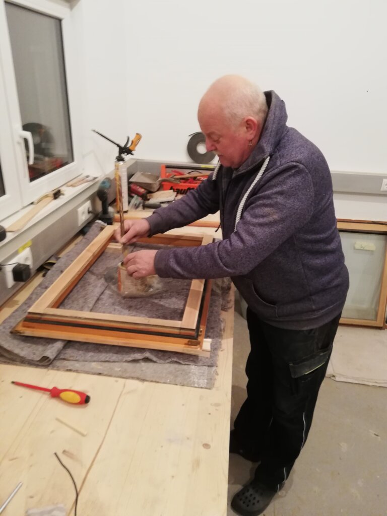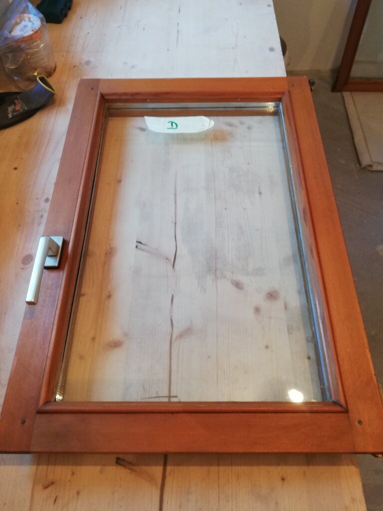 Heute haben wir das Glas ausgebaut, und ein Plan für die Stäbe erstellt, diese zugeschnitten, alles geschliffen und das erste Mal lasiert.