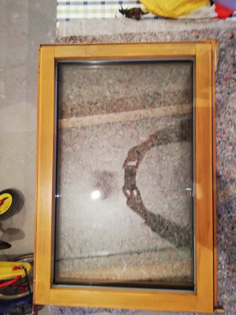 Wir haben die am Vortag lasierten Fensterrahmen nochmals lasiert, dann die Stockrahmen der Fenster geschliffen und auch 2 Mal lasiert.