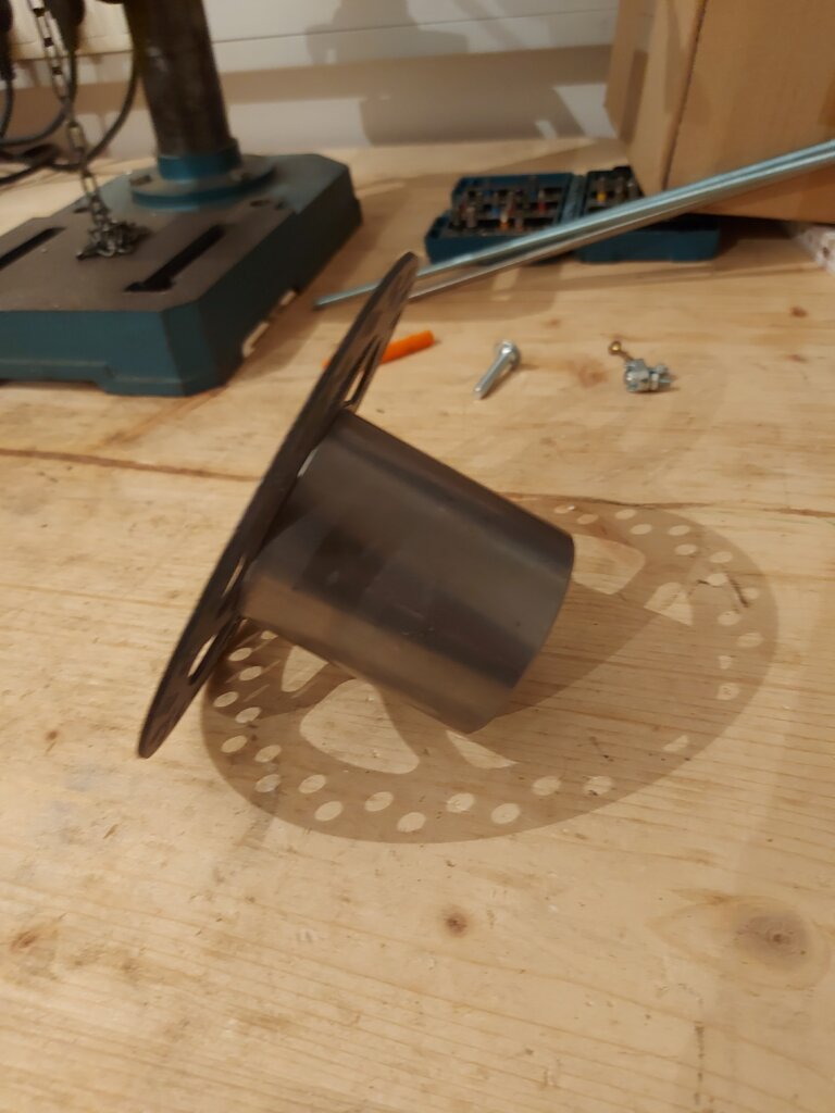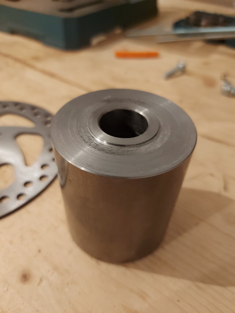 Das zweite Drehteil ist ein Adapter der für die Befestigung der Bremsscheibe an der 20mm Achse. Die Bremsscheibe hat einen Innendurchmesser von 29mm. Der Adapter stellt eine Verbindung zwischen Achse und Bremsscheibe her. Diese wir dann mit seitlich angebrachten Bohrungen an den Adapter angeschraubt. Der Adapter selbst wir mittels Bohrung durch die Achse fix mit der Achse verbunden.